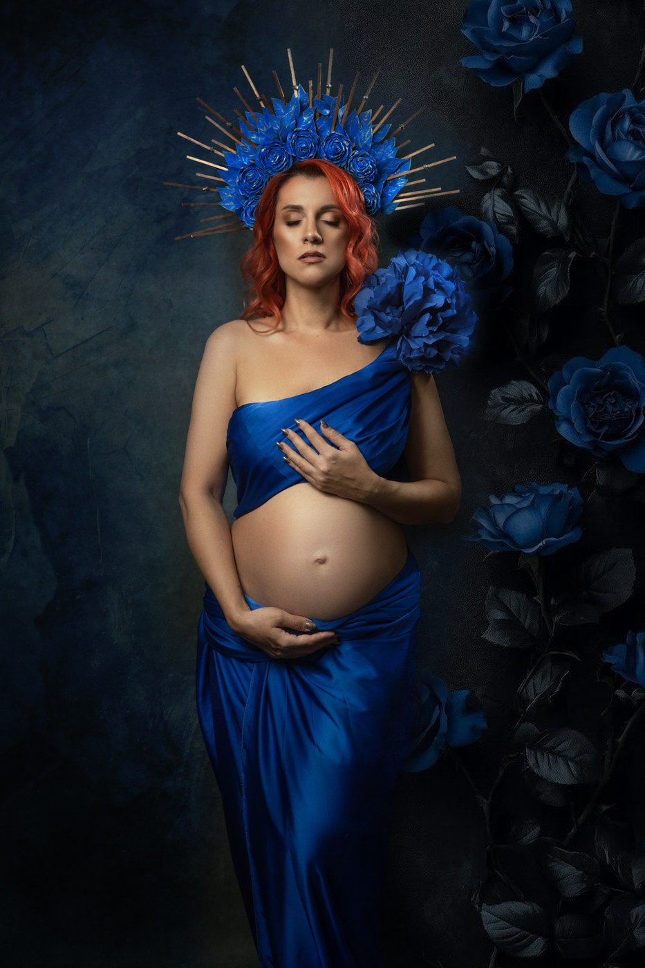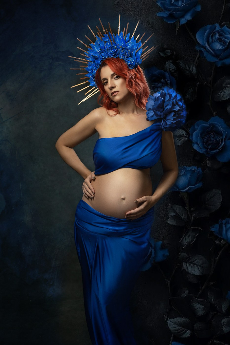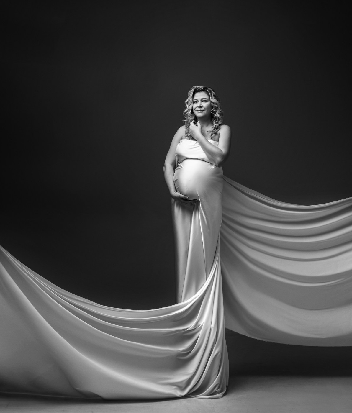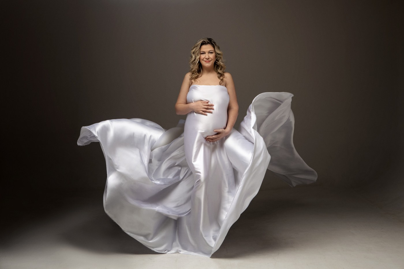 Беременная девушка позирует в фотостудии на темном фоне. На будущей маме красивая летящая золотая ткань